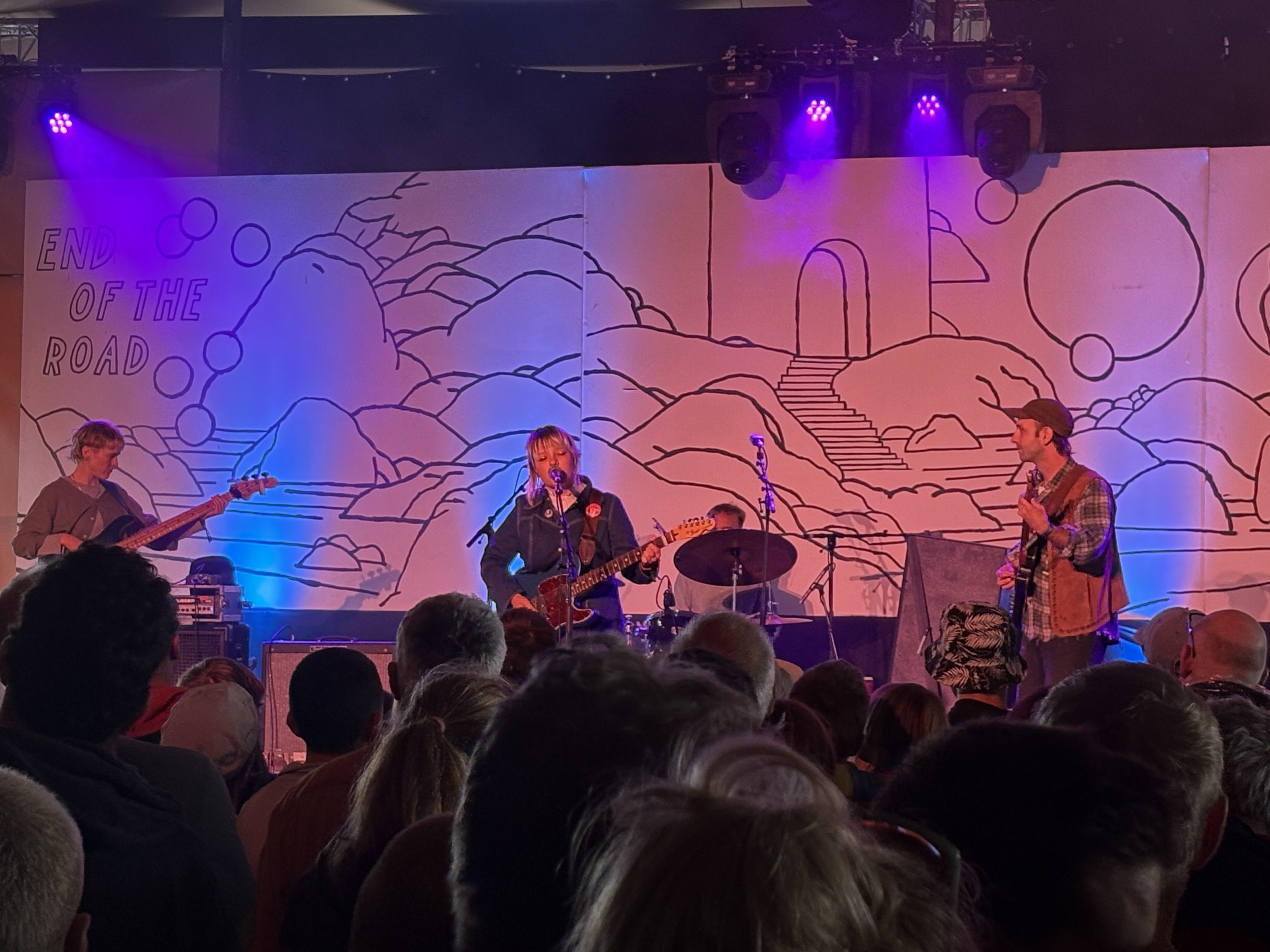 I had a break at this point, staying on site. A cup of tea from the double decker bus. A very nice couple joined me at my table and offered me a duck spring roll, which I declined, and then some chocolate tiffin, which I couldn’t resist. It was perfect with the tea. Suitably revived – all the standing is hard work these days – the next gig was the splendidly-named Horse Jumper of Love at the Folly. When I heard them on the EOTR playlist I thought of Radiohead, but Wikipedia gets it right, classifying them as slowcore, slacker rock, shoegaze. They are from Boston, Massachusetts and were cooler than your average shoegaze band. And better – I really enjoyed the performance, and I was at one with the crowd in that respect. A great atmosphere, a good band.