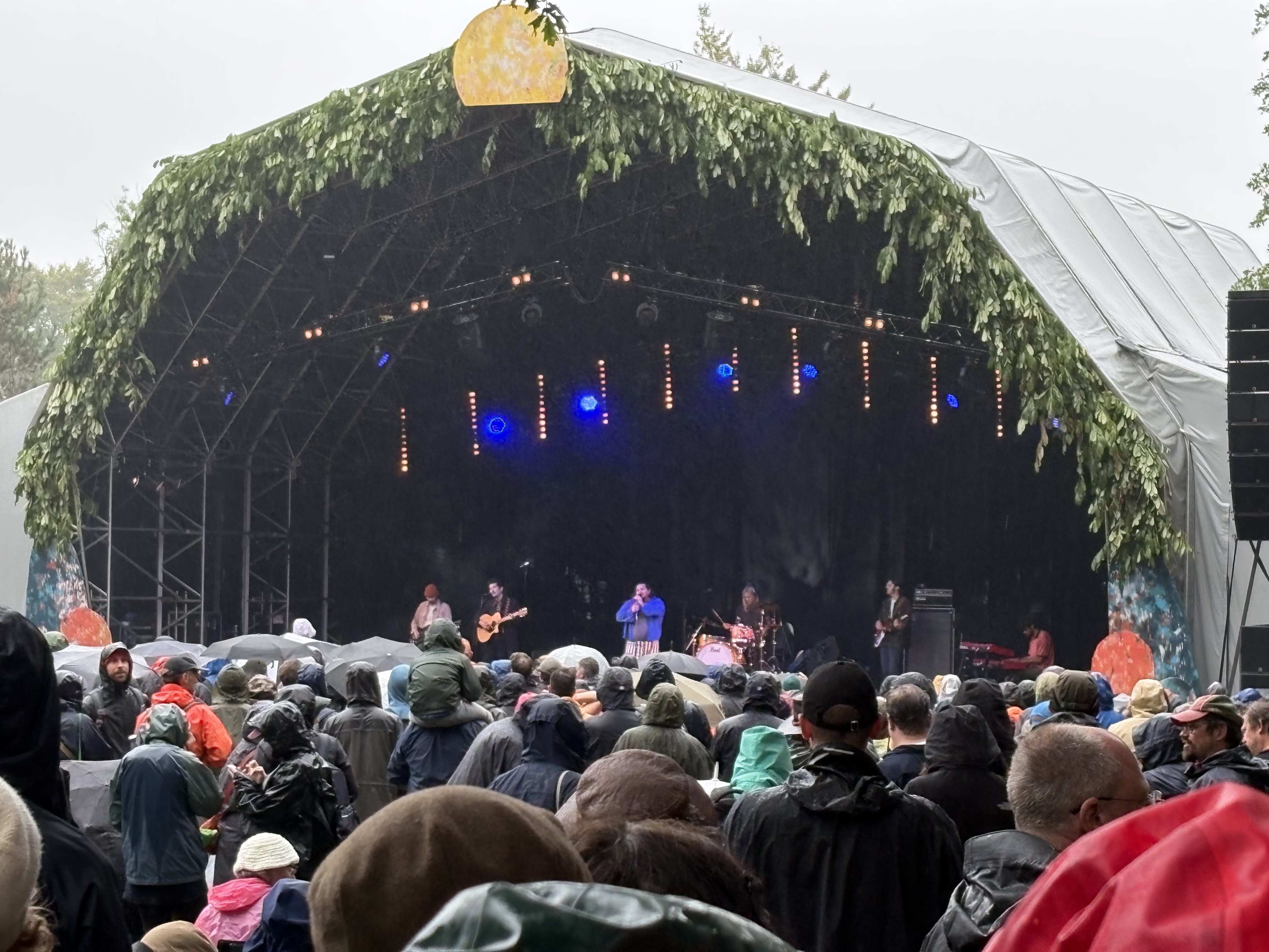 It was Mary in the Junkyard at the Big Top next. I like them – saw them play at the ICA in London last year. A woozy indie rock sound. I just got in, with all the people escaping the rain. There’s no way they would have filled the tent on a dry day – they are good, but not that well-known. I stood at the back, peering over and between heads, and soon thought, I’m not really enjoying this. So I left after three songs and went down to the Woods Stage to watch the ever-reliable Golden Dregs in the rain with most of our lot. Singer and band leader Benjamin Woods crooning, lovely harmonies, a mellow groove that reminds me of past bands like Lloyd Cole and the Commotions and Tindersticks. They’re a good band.