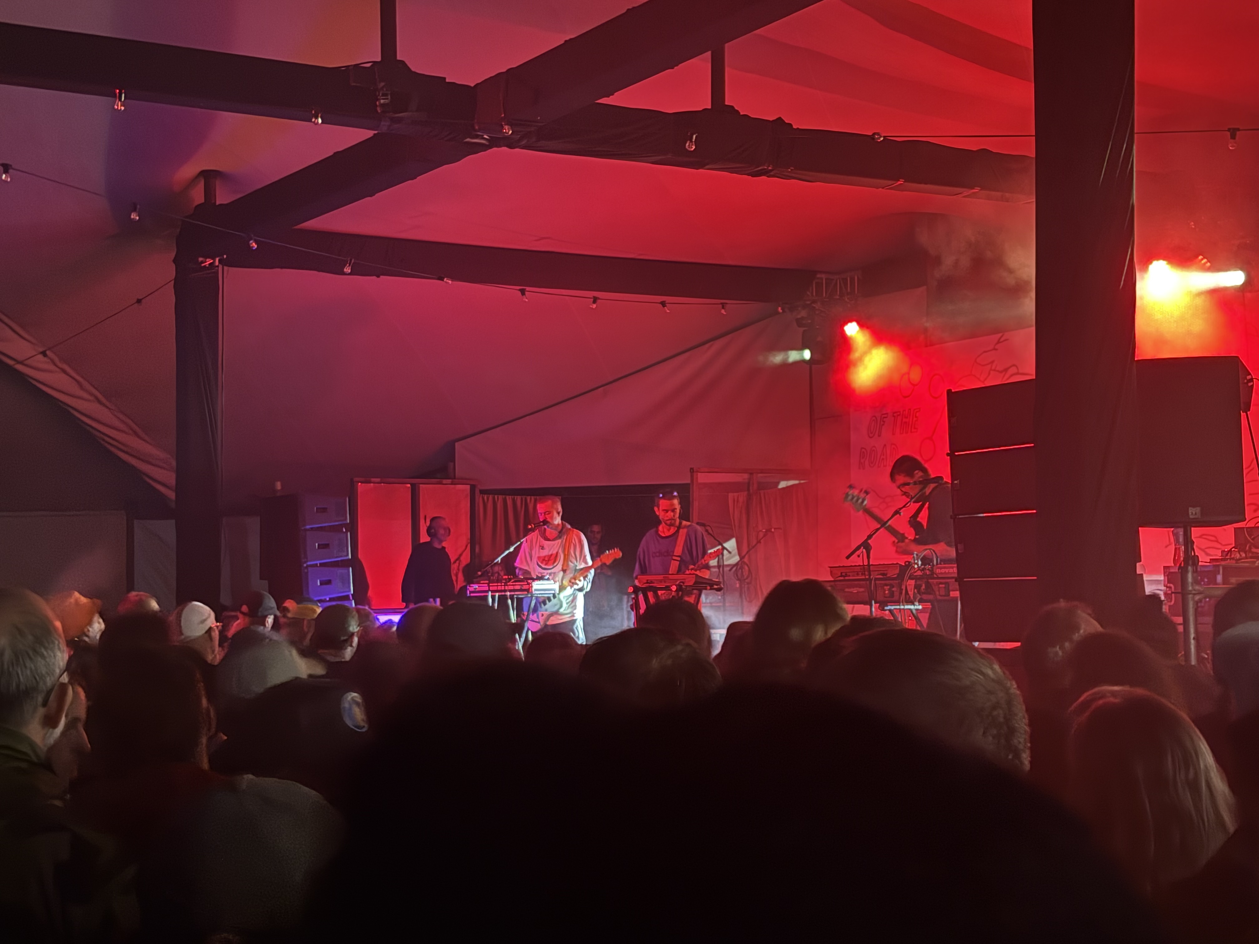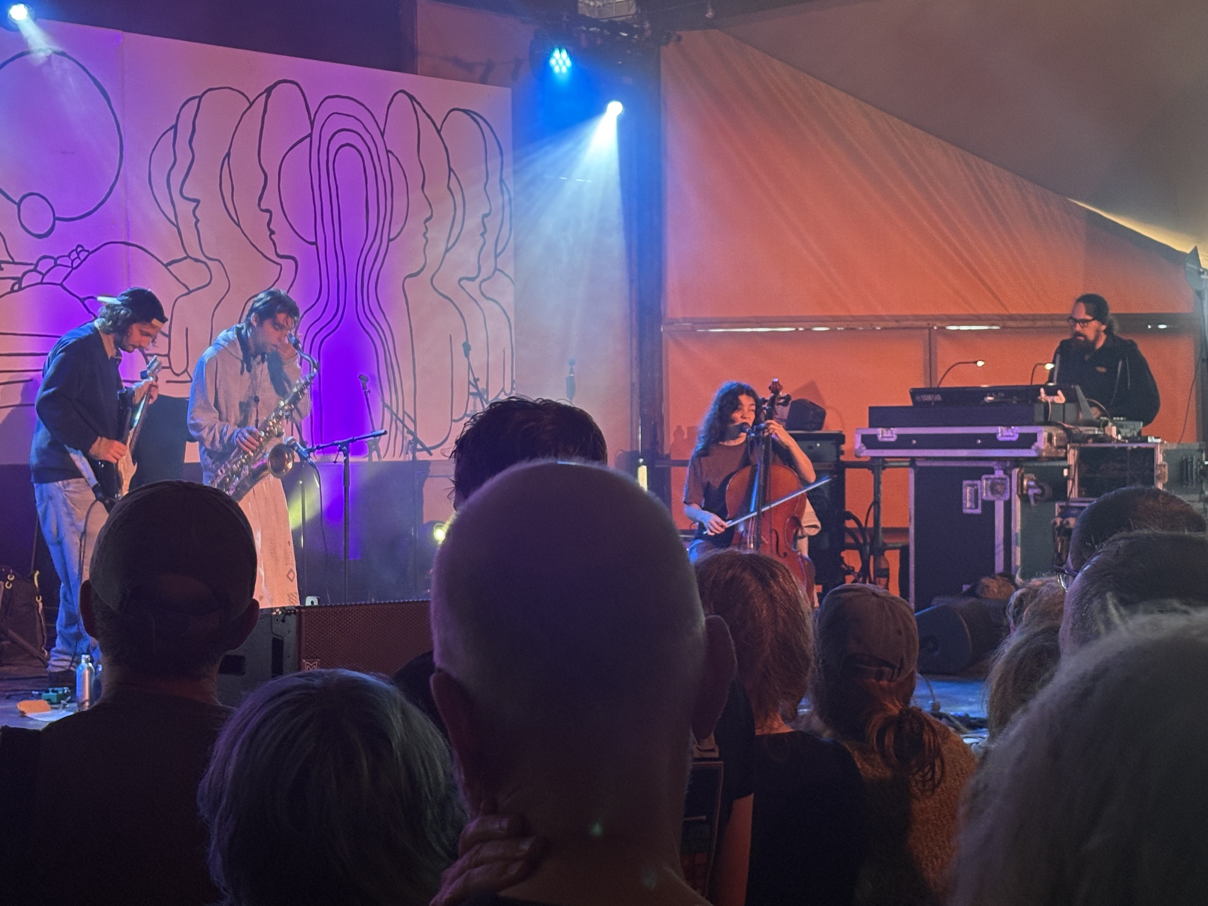 First music of the day at twelve. A classic EOTR clash. Three artists I wanted to see. On the garden stage, a Texan guitarist called Hayden Pedigo. In the Big Top, Belfast noise rock band Makeshift Art Bar, and in the Folly, indie-soul singer Uwade. Left to my own devices I might have gone for Hayden Pedigo, as I enjoy starting the day at the Garden Stage. But the collective decision was the noise of Makeshift Art Bar – where did that name come from? And they were good. Of the slow-fast-slow variety, with slashing rhythms and a wall of sound in the fast bits. An ominous feel to it all. Not the most relaxing start, but worth the trip.