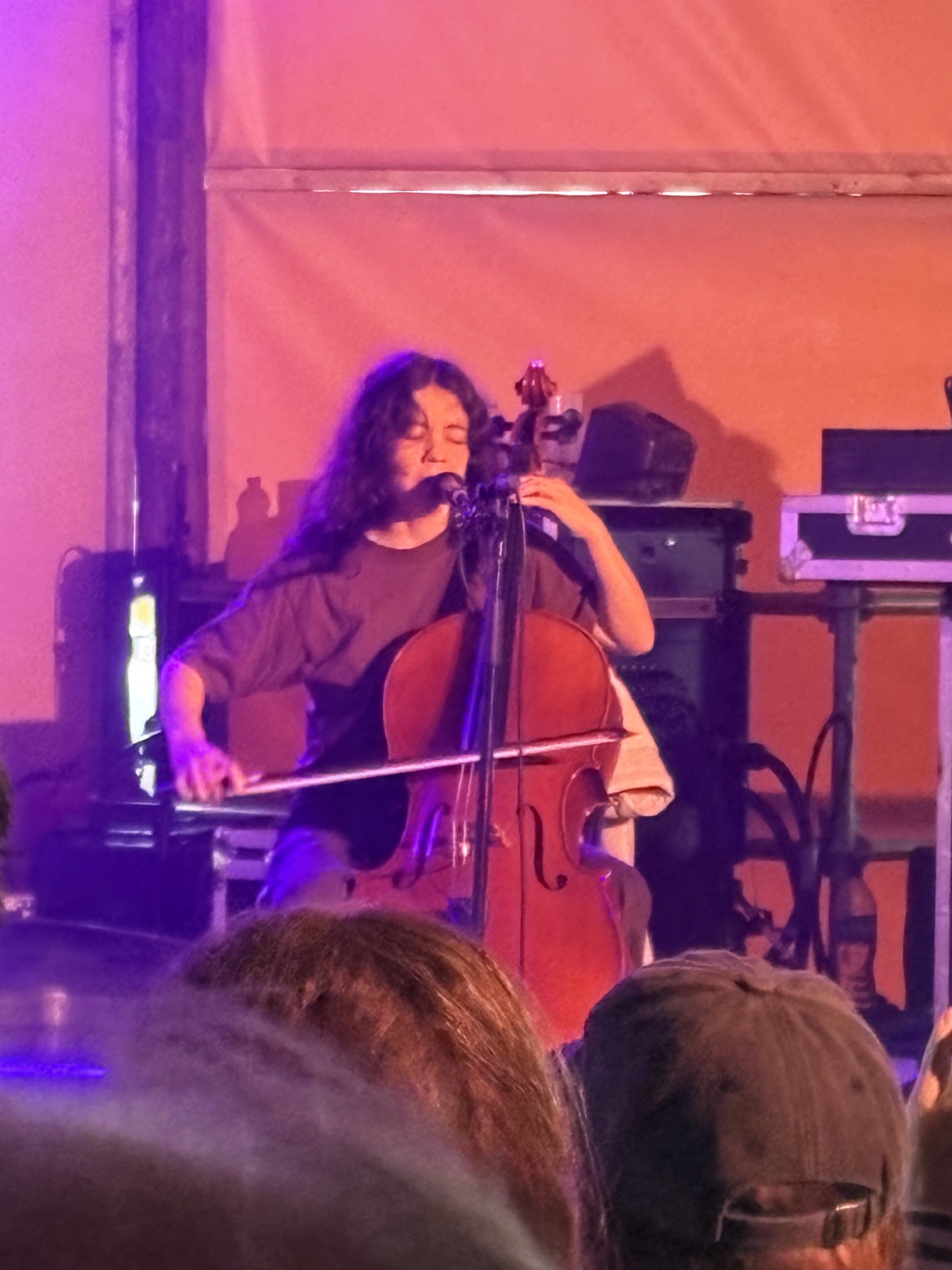 The Line of Best Fit article that included Laura Barton’s endorsement of Tyler Ballgame also featured a piece on a singer called Black Fondu, written by LOBF’s editor, Paul Bridgwater. He declared that the artist would be one of the most divisive at EOTR and suggested that the 6 Music Dads would “toss out Paddington-like hard stares and tut about ‘real instruments’ before retreating back to whatever Big Thief side project is happening elsewhere.” Naturally, Jon, Shane and I, as bona fide 6 Music Dads, took this as a challenge, and so wandered up to the Boat Stage after Tyler Ballgame to catch the show. The place was heaving, as usual. Black Fondu was leaping around to an electronic beat and rapping over the top. We didn’t tut about real instruments, but quickly concluded that it wasn’t for us and left. But there being no Big Thief side projects available I managed to entice Jon and Shane into the Folly to watch a real favourite of mine, Mabe Fratti. She’s a cellist from Guatemala, based in Mexico who plays music that combines the avant garde with a real sense of beauty. Search her name on my blog for more references – I’ve seen her a few times over the years.