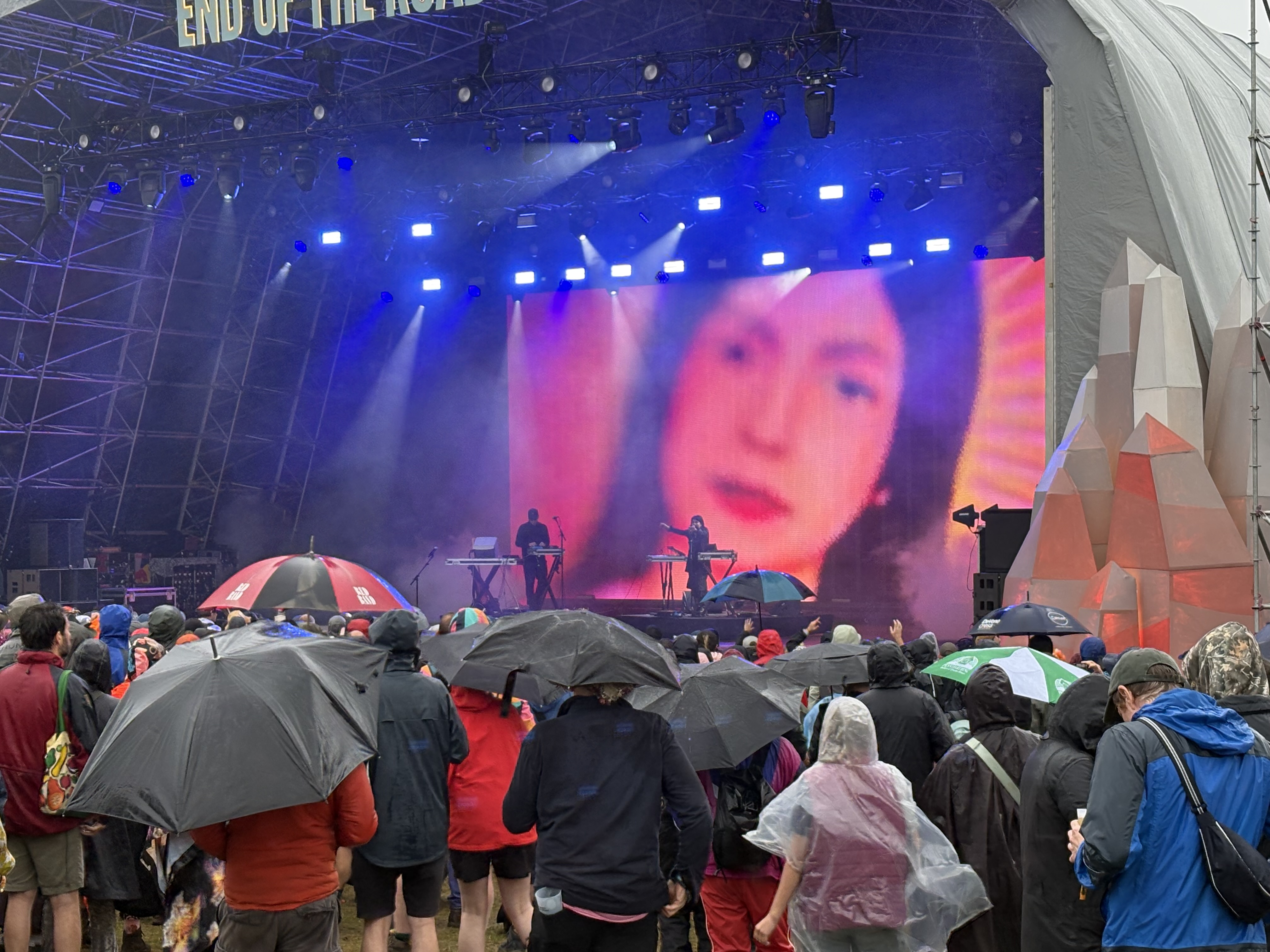 Defying the rain, our next call was Peruvian DJ and producer Sofia Kourtesis. She combines electronic dance sounds with an infectious Latin groove. Perfect for dancing to on a balmy summer’s evening. Or how about standing in a field under a mass of grey cloud and an insistent downpour which whipped into your side when a gust of wind came from an unexpected direction? Well, it kind of worked! Sofia performed heroically on stage, which was all the more notable when you consider that she’d lost her mother only a couple of days before. And the crowd, while diminished in size, responded in kind – there was a lot of dancing under the umbrellas and the raincoats. The upper lips were stiff, but not the limbs!